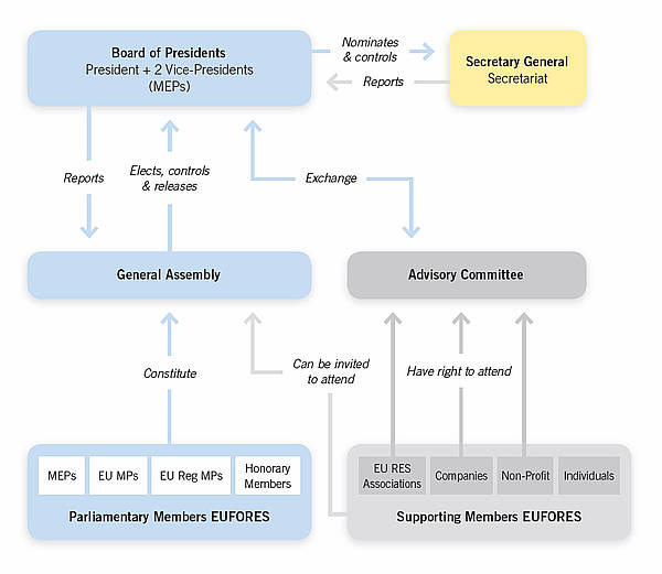 The Board of Presidents, the organisation’s governing body, consists of three Members of the European Parliament (the President and the two Vice-Presidents) who are appointed by the General Assembly.