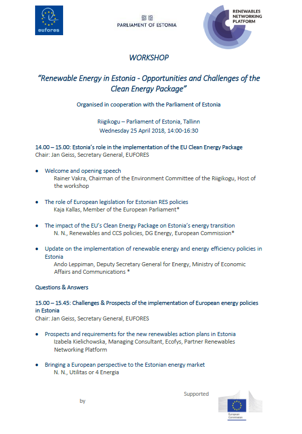 EUFORES, in cooperation with the Riigikogu Environment Committee organised a national Parliamentary workshop in the Estonian Parliament. This workshop focused on the renewables situation in Estonia: the challenges renewable energy faces, the opportunities it brings and the way how to move progressively forward to 2020, 2030 and beyond.