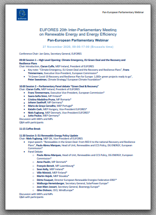 The EUFORES annual Inter-Parliamentary Meeting on Renewable Energy and Energy Efficiency took place on 27 November 2020. Due to the Covid-19 crisis, IPM20 was held as a Pan-European Parliamentary Webinar (ZOOM webinar).
