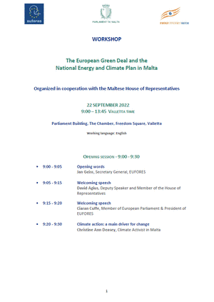 The European Forum for Renewable Energy Sources - EUFORES - organized a national parliamentary workshop in the Parliament of Malta on renewable energy and energy efficiency, in cooperation with the Maltese Parliament, Deputy Speaker and Member of the Maltese Parliament Mr. David Agius and the Ministry for Environment, Energy and Enterprise.