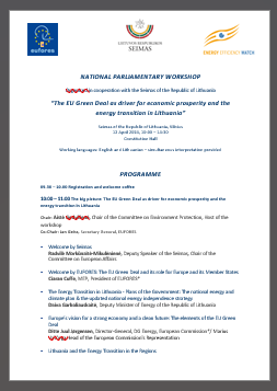 A high level debate of Lithuanian Members of Parliament with top speakers and representatives from European Parliament, National Government, the European Commission, industry, science and NGO representatives was held to discuss the prospects of renewable energy and energy efficiency in Lithuania with a special focus on the EU Green Deal.